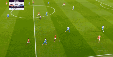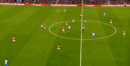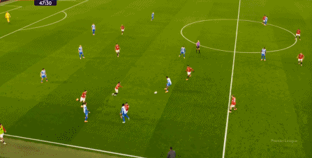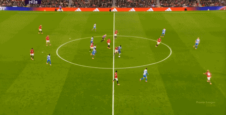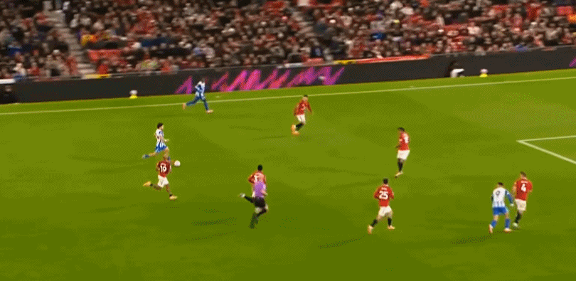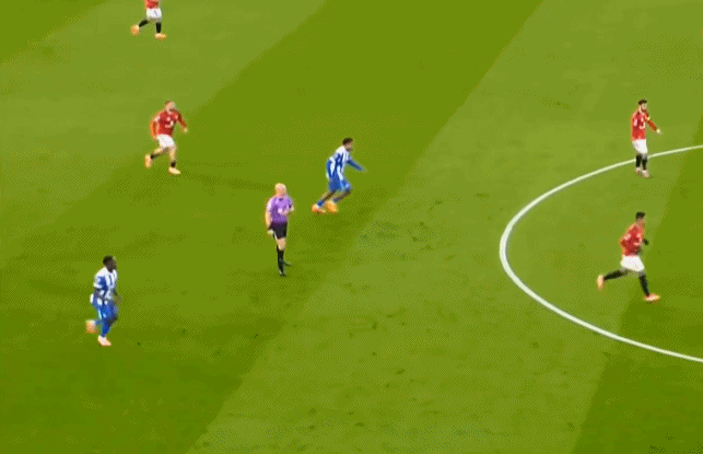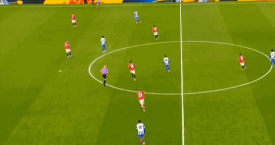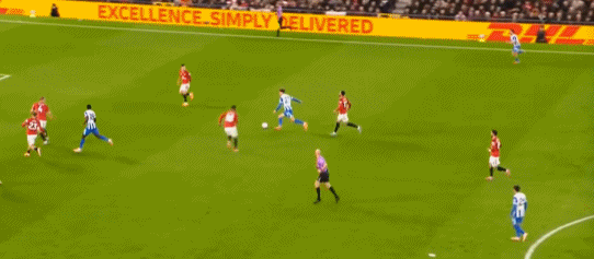 所以在开局阶段,在曼联还没有进球之前,布莱顿就已经可以通过曼联在某个局部的人盯人失败,从而获得非常好的机会: